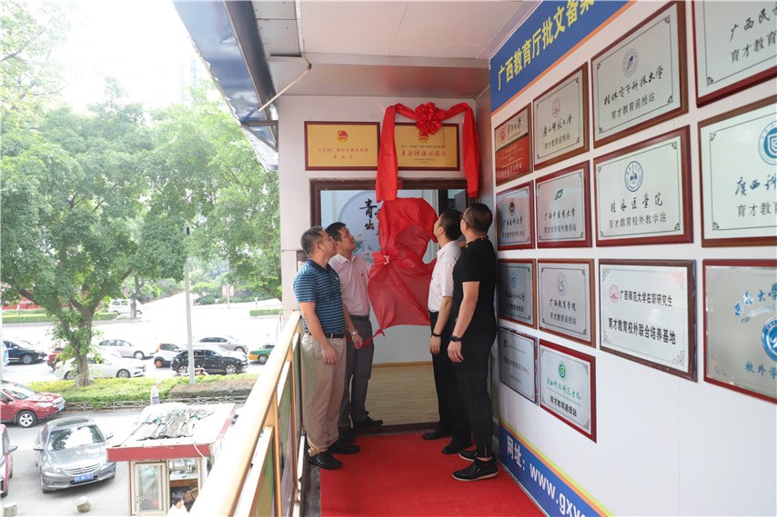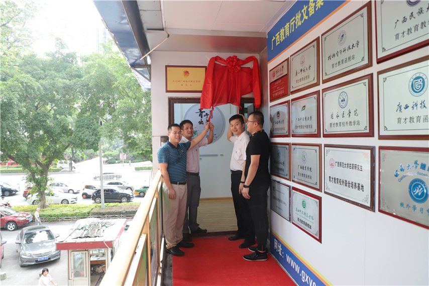 ▲共青團柳州市委員會副書記李玉輝(右二)、魚峰區(qū)委副書記王漢強(左二)、共青團魚峰區(qū)委員會書記鐘俊峰(右一)、育才集團聯(lián)合黨委書記蔣華(左一)出席參加揭牌儀式