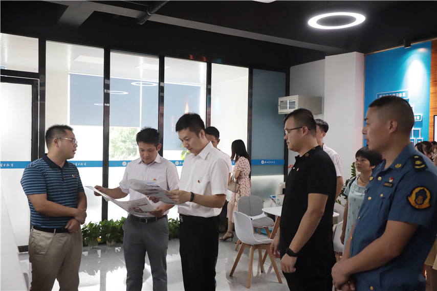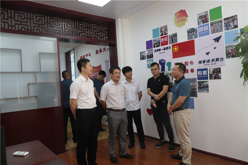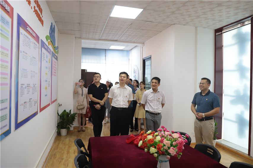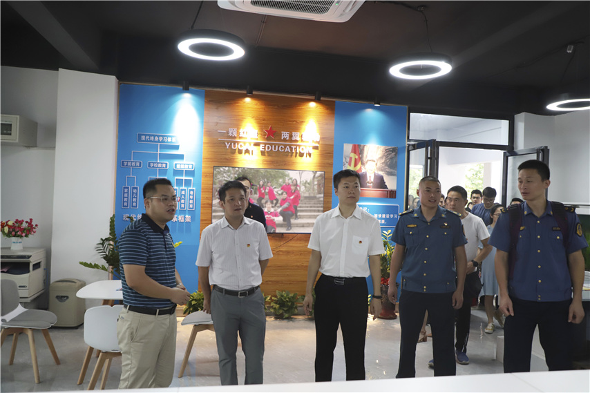 ▲共青團柳州市委員會副書記李玉輝(前排中)、魚峰區(qū)委副書記王漢強(左二)參觀育才辦公環(huán)境