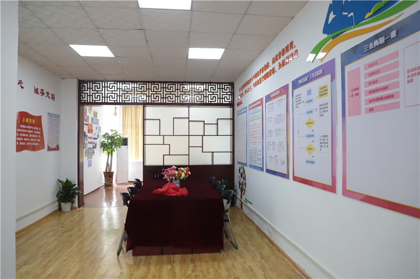 ▲共青團柳州市委員會副書記李玉輝(左三)、魚峰區(qū)委副書記王漢強(右二)、共青團魚峰區(qū)委員會書記鐘俊峰(左二)參觀育才共青團廣西育才教育集團委員會團建示范點建設(shè)