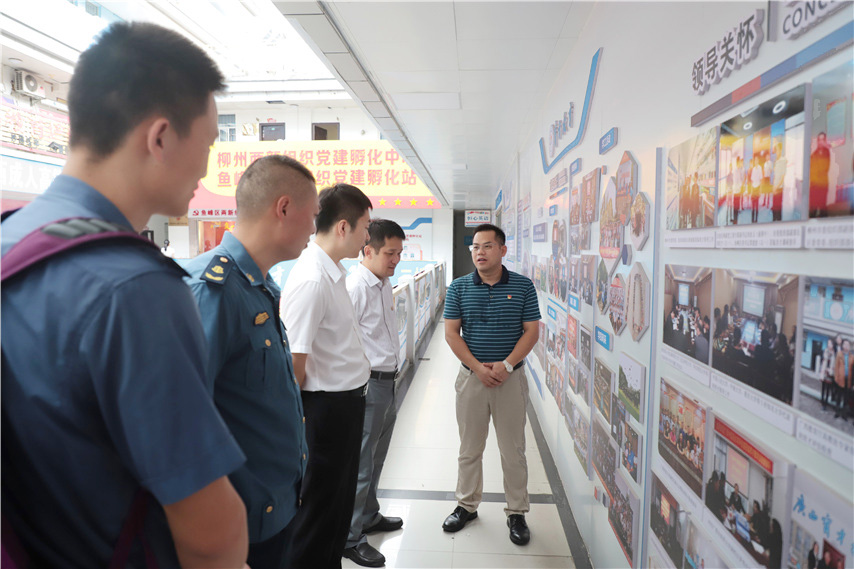 ▲共青團柳州市委員會副書記李玉輝(左二)、魚峰區(qū)委副書記王漢強(左三)了解孵化站師資情況