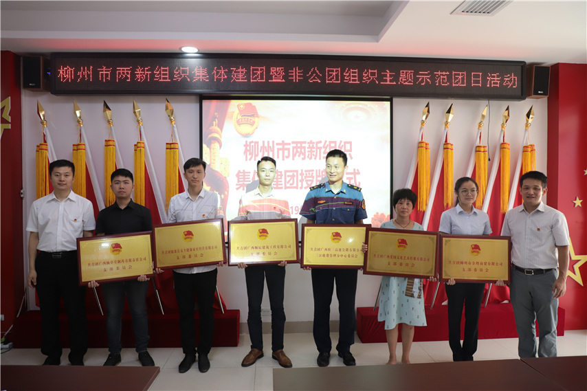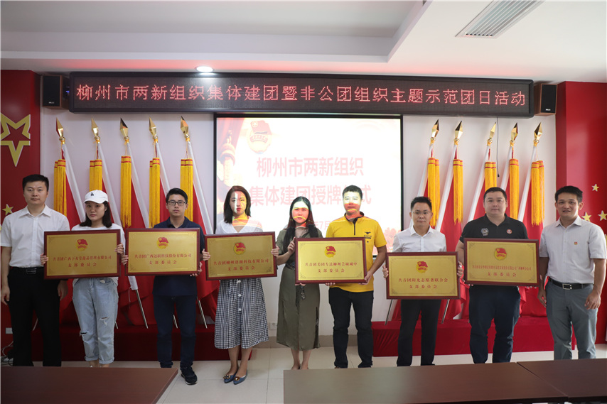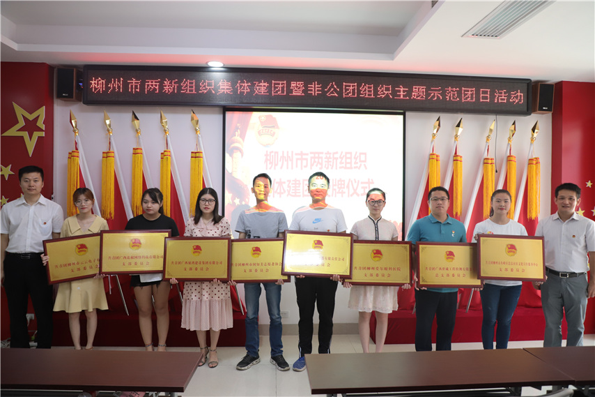 會上,出席活動的各位領(lǐng)導(dǎo)為新建團的兩新組織代表頒發(fā)團組織牌匾并合影留念。