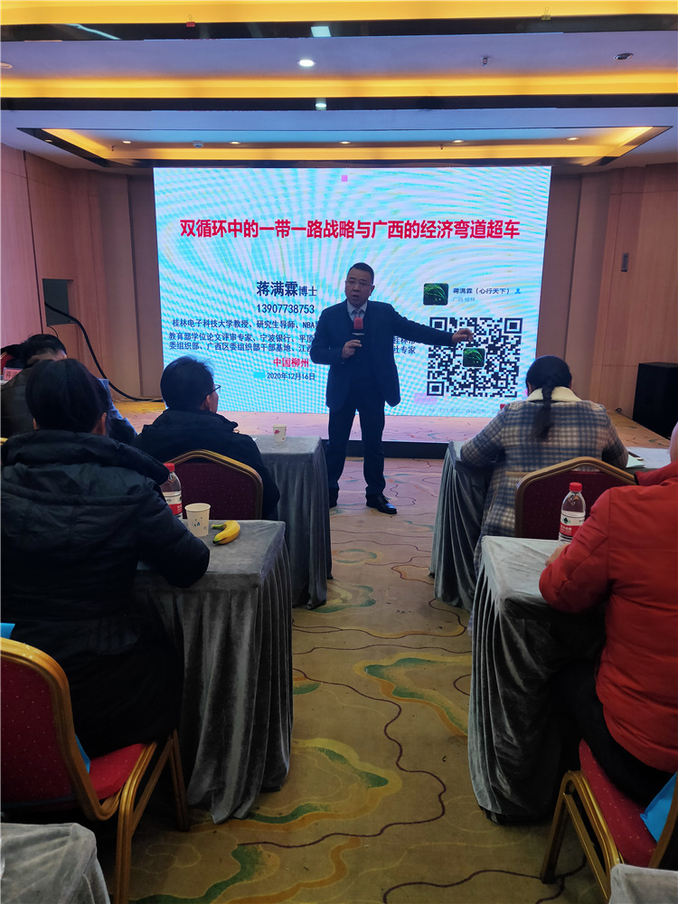 桂林電子科技大學(xué)教授、研究生導(dǎo)師蔣滿霖博士以《雙循環(huán)中的一帶一路戰(zhàn)略與廣西的經(jīng)濟(jì)彎道超車》從廣西自身優(yōu)勢,以及當(dāng)前面臨的形勢等方面對其進(jìn)行分析,并對其發(fā)展提出可行性建議。