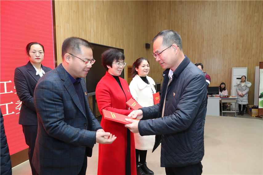 劉慶寧、王漢強(qiáng)、彭靖向9名來(lái)自各行業(yè)的黨支部書(shū)記代表贈(zèng)送黨的組織生活十大情景模擬課程體系光盤(pán)。