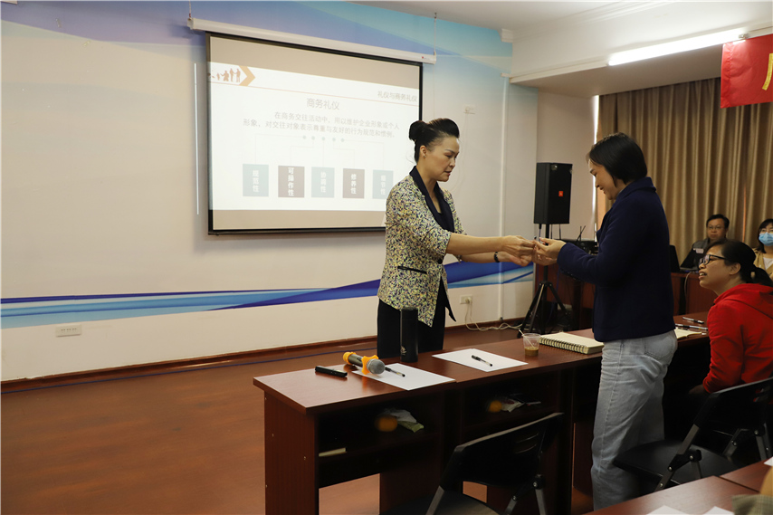 譚成芝教授采用“理論講解+親身示范+實(shí)操訓(xùn)練”的教學(xué)方式,從工作意識(shí)、職業(yè)素養(yǎng)、規(guī)范的職業(yè)形象塑造、溝通技巧、商務(wù)禮儀等板塊,深入淺出地講解了商務(wù)交往與接待禮儀實(shí)務(wù),通過PPT展示、互動(dòng)問答、實(shí)操教學(xué)等形式,讓大家直觀地感受到“什么是職業(yè)形象”,大家在輕松愉快的氛圍中掌握了豐富且實(shí)用性較強(qiáng)的商務(wù)禮儀知識(shí),對(duì)今后的工作有較高的指導(dǎo)作用。