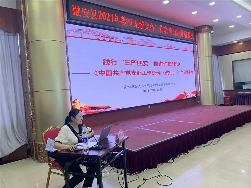 ▲柳州職業(yè)技術(shù)學(xué)院馬克思主義學(xué)院景凌凌老師作《踐行“三嚴四實”推進作風建設(shè)——《中國共產(chǎn)黨支部工作條例(實行)》條例解讀》授課
