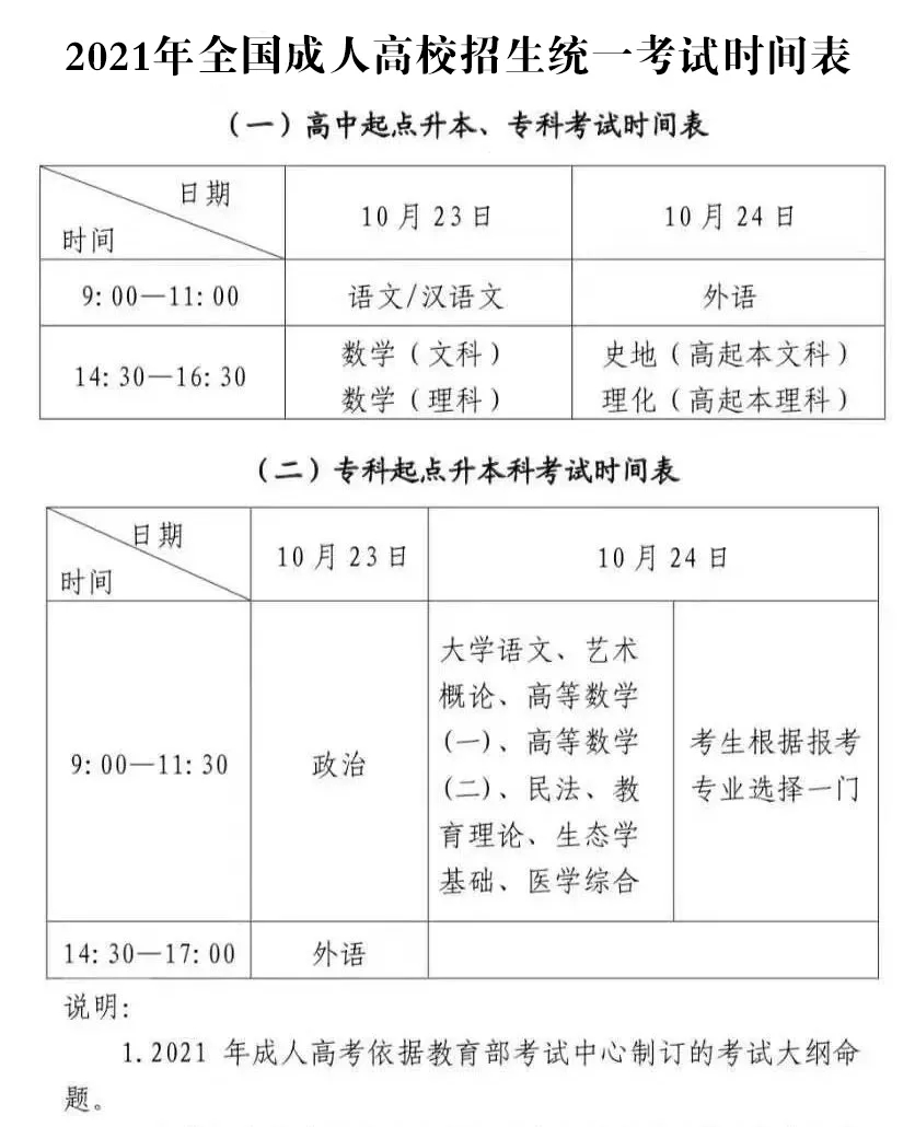 (一)2021年成人高考考試時(shí)間:10月23-24日