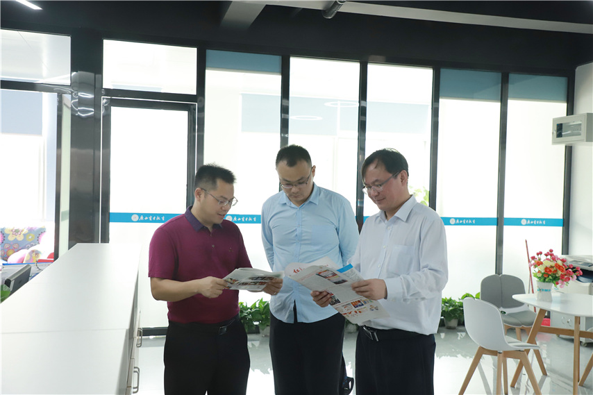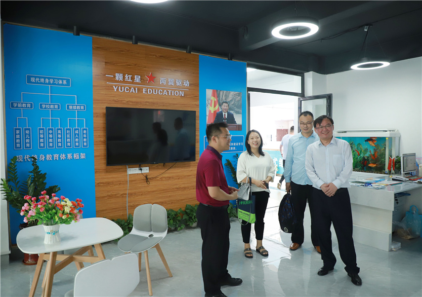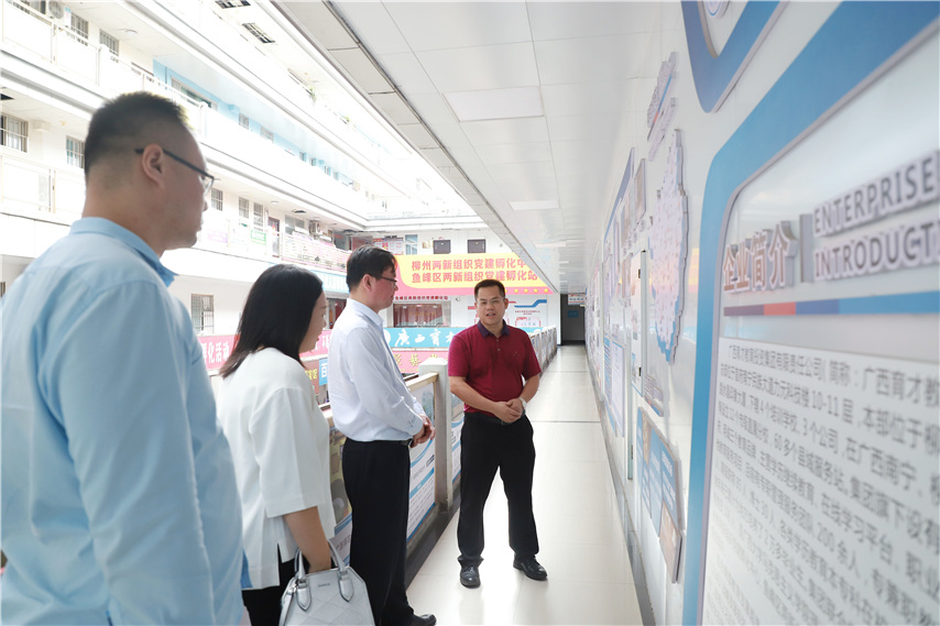 ▲王長(zhǎng)明先生(右一)參觀育才柳州本部辦公環(huán)境