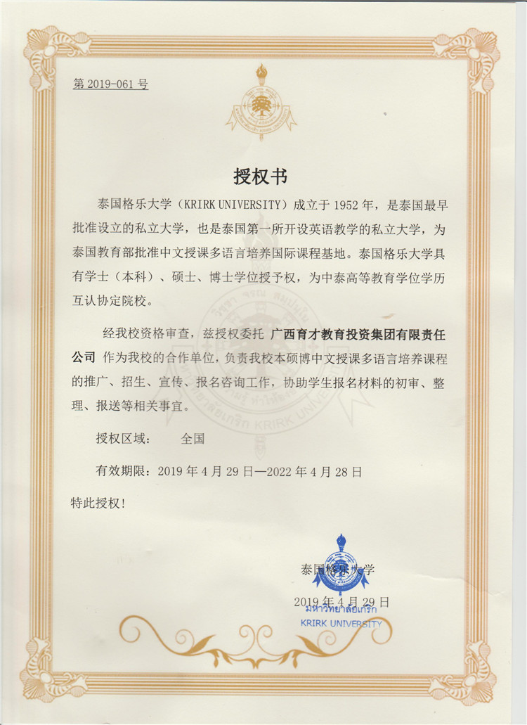 ▲泰國(guó)格樂(lè)大學(xué)授權(quán)書(shū)