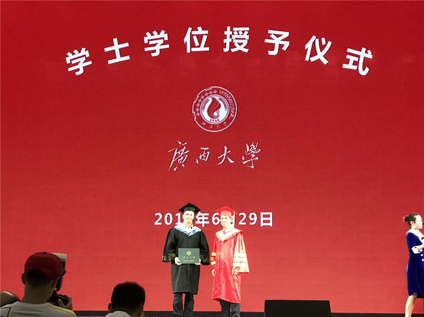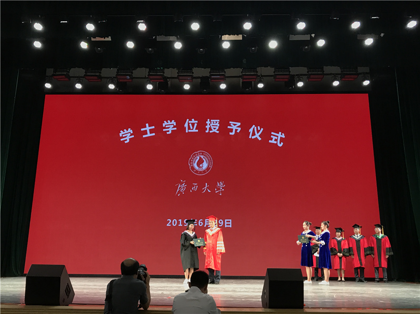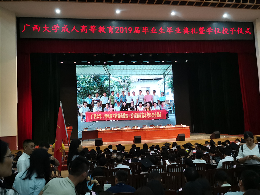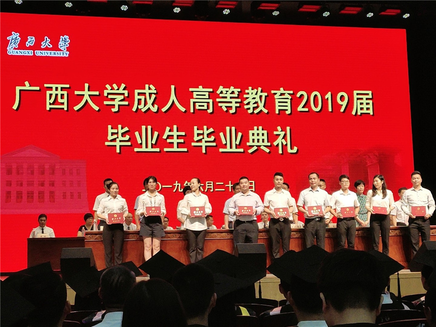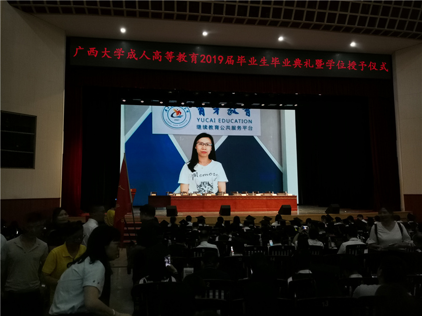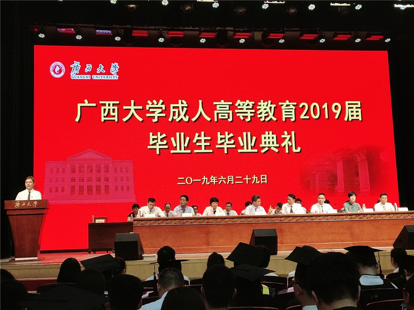 6月29日,廣西大學(xué)成人高等教育2019屆畢業(yè)生畢業(yè)典禮暨學(xué)位授予儀式在廣西大學(xué)校本部大禮堂隆重舉行。校黨委常委、總會(huì)計(jì)師寧旭初、繼續(xù)教育學(xué)院院長(zhǎng)蘇兆成、副院長(zhǎng)王曉花、陳海、譚鴻禹、各科室科長(zhǎng)老師、校友代表、各函授點(diǎn)(教學(xué)點(diǎn))負(fù)責(zé)人及2019屆成人高等教育畢業(yè)生代表1400余人參加了典禮。我函授站站長(zhǎng)蔣華參加了典禮,典禮由繼續(xù)教育學(xué)院院長(zhǎng)蘇兆成主持。