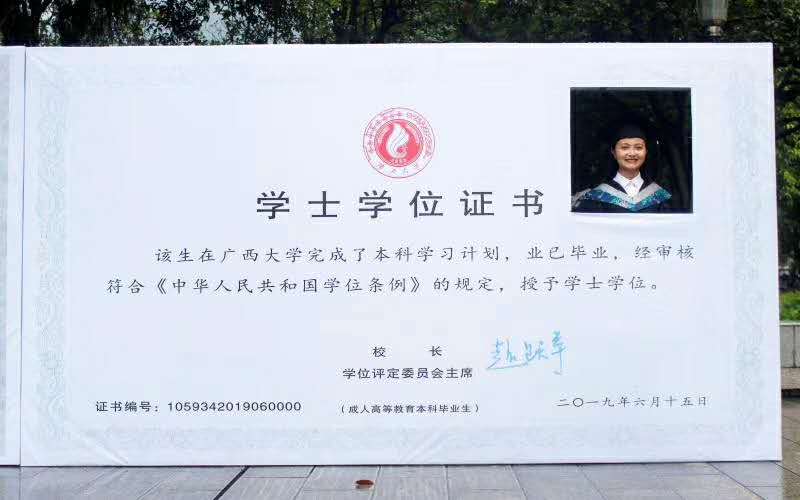 在隨后進(jìn)行的學(xué)位授予儀式上,繼續(xù)教育學(xué)院院長(zhǎng)蘇兆成宣讀了關(guān)于授予廣西大學(xué)成人高等教育本科畢業(yè)生成人高等教育學(xué)士學(xué)位的決定,寧旭初總會(huì)計(jì)師逐一為畢業(yè)生代表?yè)芩胝趫?zhí)“撥穗禮”,頒發(fā)學(xué)位證書(shū)并與同學(xué)合影。