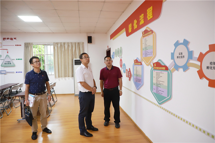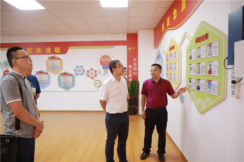 ▲團市委副書記張揚(中)、團市委組織部副部長華海濤(左一)參觀黨建孵化站建設