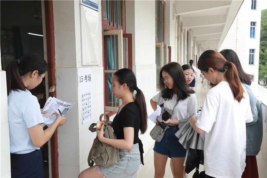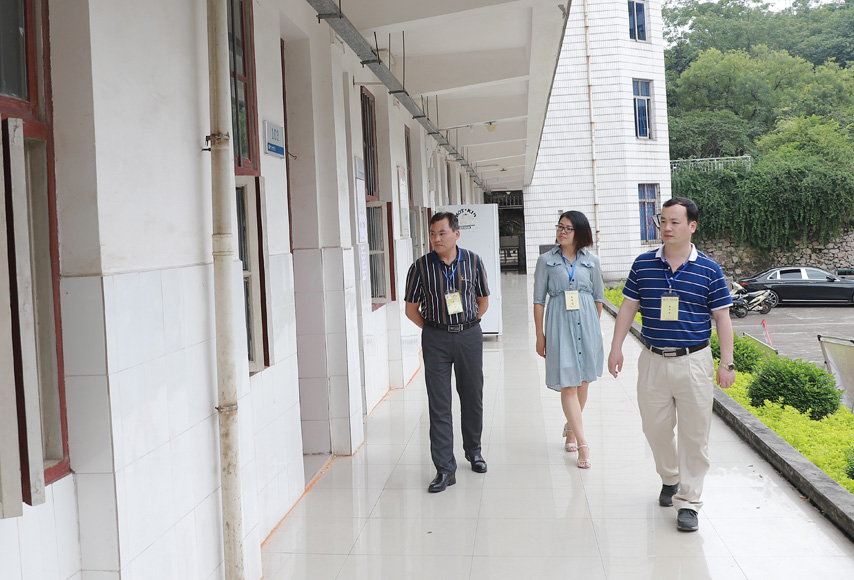 ▲廣西師范大學繼續(xù)教育學院副院長蔣冬青(左一)到柳州考點巡考