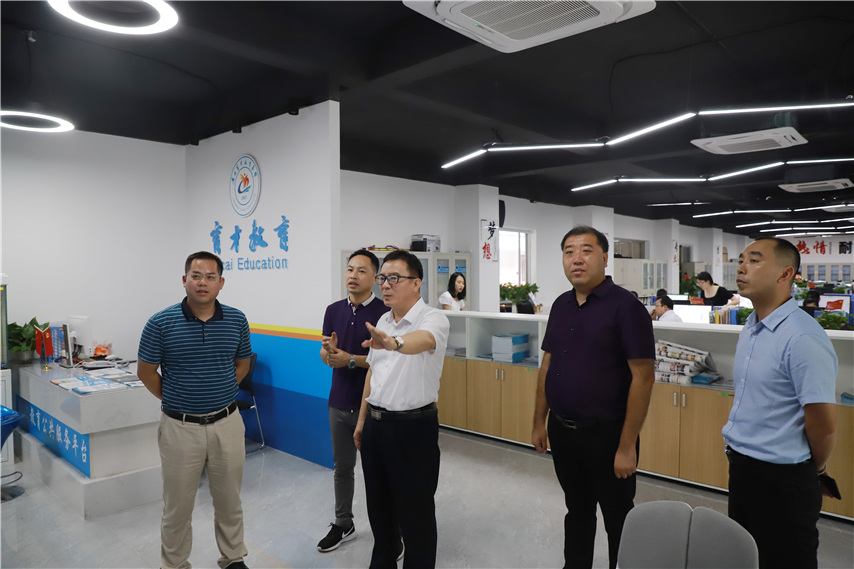 ▲廣西理工職業(yè)技術(shù)學(xué)院副院長(zhǎng)黃日木(中)、繼續(xù)教育學(xué)院院長(zhǎng)盛丹(右二)參觀育才辦學(xué)環(huán)境