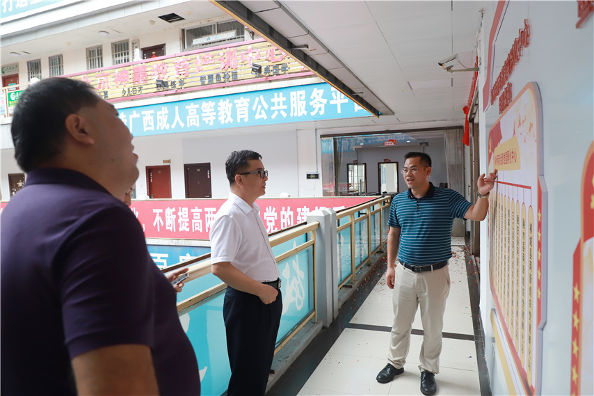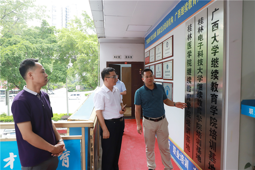 ▲廣西理工職業(yè)技術(shù)學(xué)院副院長(zhǎng)黃日木(右二)、繼續(xù)教育學(xué)院院長(zhǎng)盛丹(左一)參觀育才辦學(xué)環(huán)境