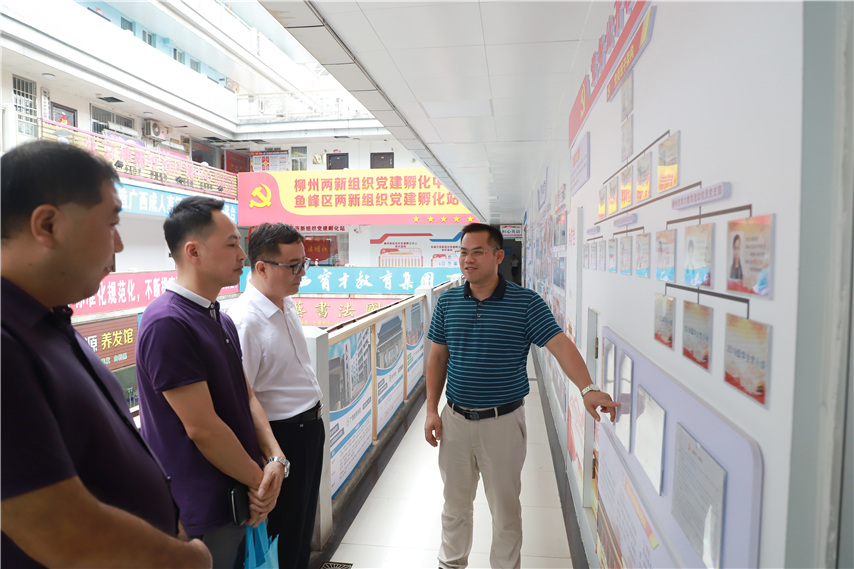 ▲廣西理工職業(yè)技術(shù)學(xué)院副院長(zhǎng)黃日木(右二)、繼續(xù)教育學(xué)院院長(zhǎng)盛丹(左二)參觀孵化站建設(shè)