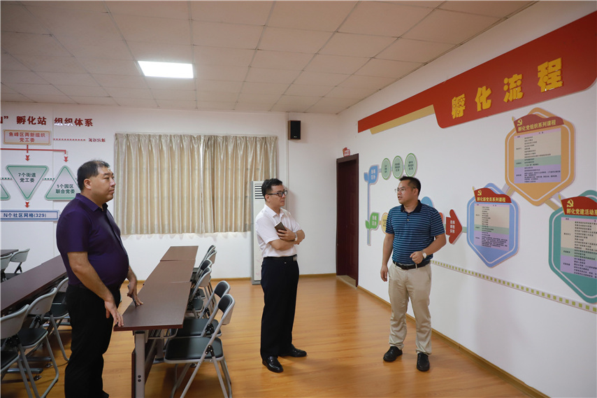 ▲廣西理工職業(yè)技術(shù)學(xué)院副院長(zhǎng)黃日木(中)、繼續(xù)教育學(xué)院院長(zhǎng)盛丹(左一)參觀孵化站建設(shè)