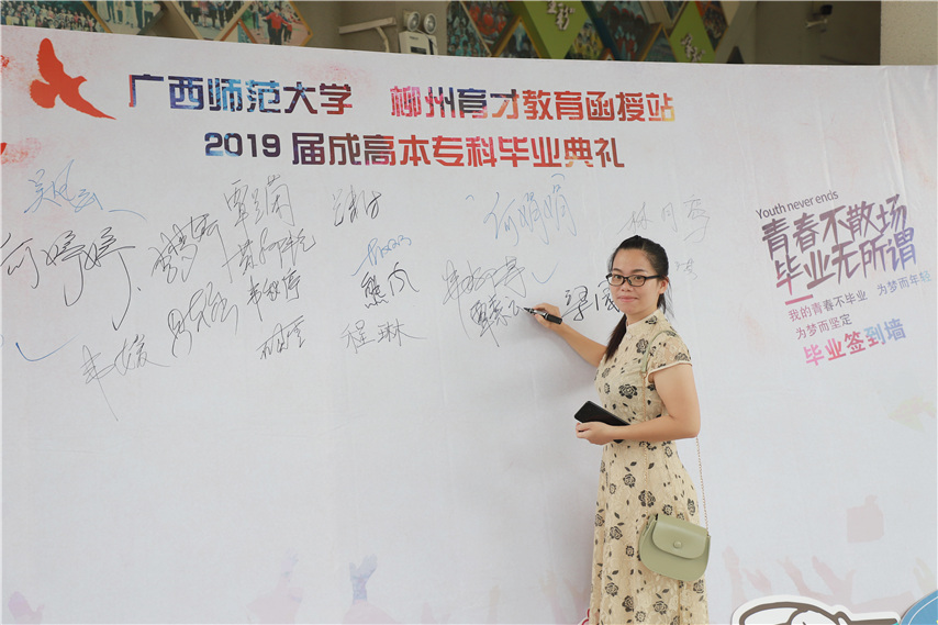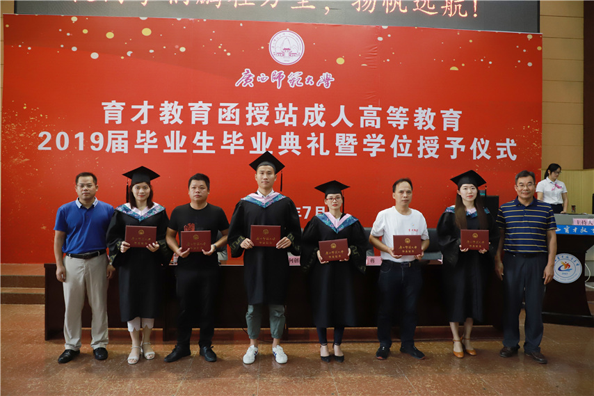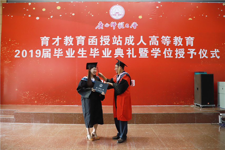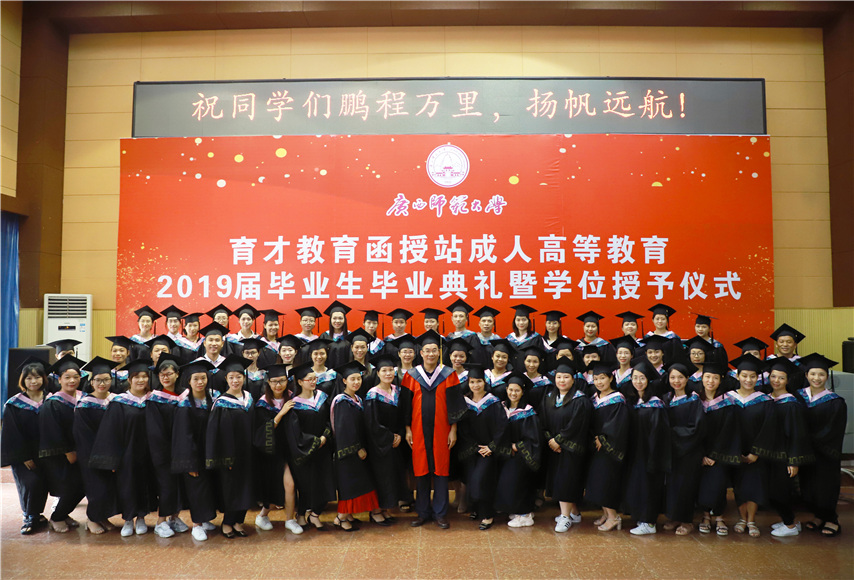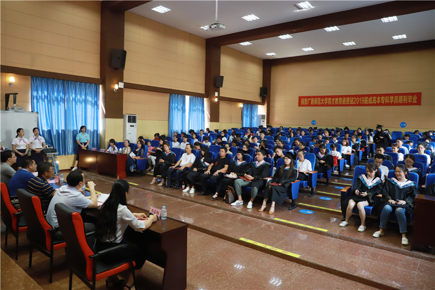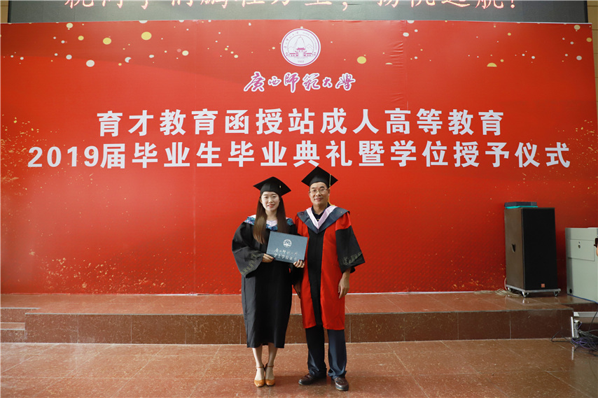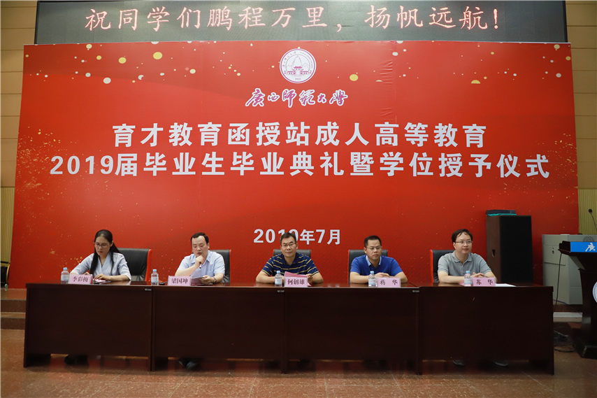 函授站站長(zhǎng)蔣華老師用十個(gè)字概況了自己的講話,一是祝賀,祝賀2019屆畢業(yè)生順利畢業(yè);二是感謝,感謝廣西師范大學(xué)送教上門;三是感恩,常懷一顆感恩的心,關(guān)心和支持廣西師范大學(xué)的發(fā)展;四是提醒,提醒畢業(yè)生妥善保管好畢業(yè)證和畢業(yè)生檔案;五是歡迎,歡迎??频耐瑢W(xué)繼續(xù)報(bào)讀本科學(xué)歷。
