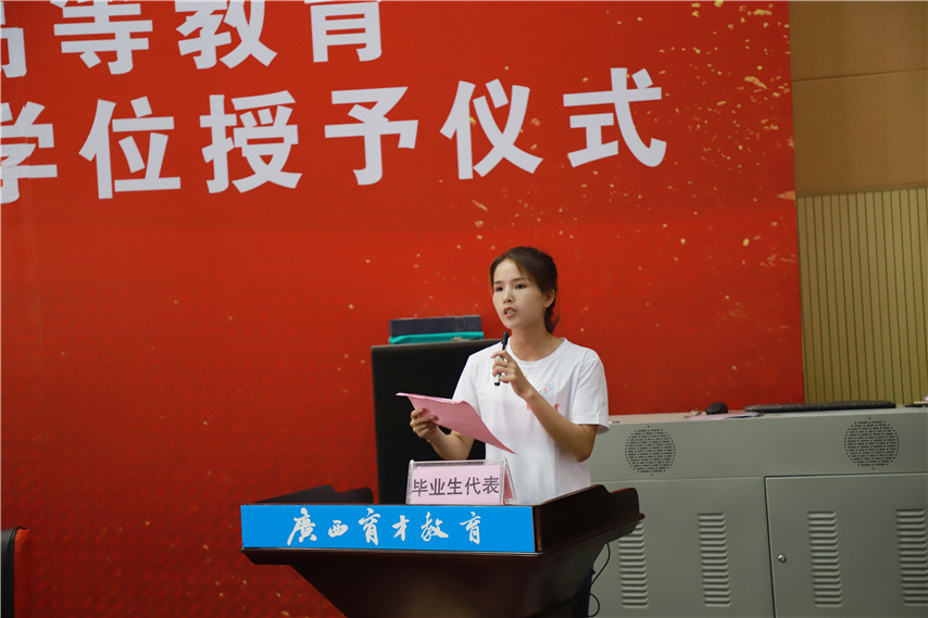 來自三江縣同樂鄉(xiāng)的吳鳳云同學(xué)作為畢業(yè)生代表發(fā)言,吳鳳云同學(xué)去年家中遭受嚴(yán)重火災(zāi),在得知吳鳳云同學(xué)的遭遇后,函授站的老師和同學(xué)們的都積極伸出援手,幫助吳風(fēng)云同學(xué)重建家園。今日的發(fā)言重現(xiàn)當(dāng)時(shí)人員受傷和家庭的困難,每一句都重新?lián)軇?dòng)在座者的心弦。