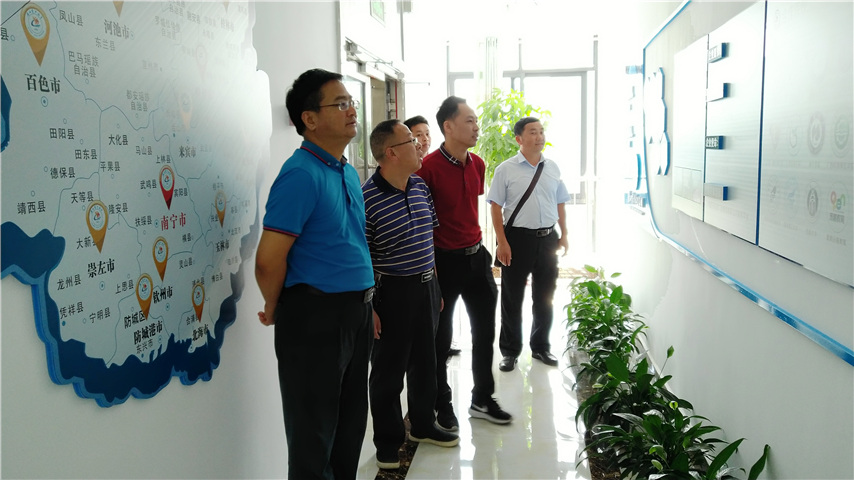 ▲廣西科技大學(xué)繼續(xù)教育學(xué)院院長(zhǎng)韋鴻鵬(左一)、副院長(zhǎng)楊勝(左二)、學(xué)歷教育科科長(zhǎng)吳衛(wèi)龍(右一)參觀南寧總部辦公環(huán)境