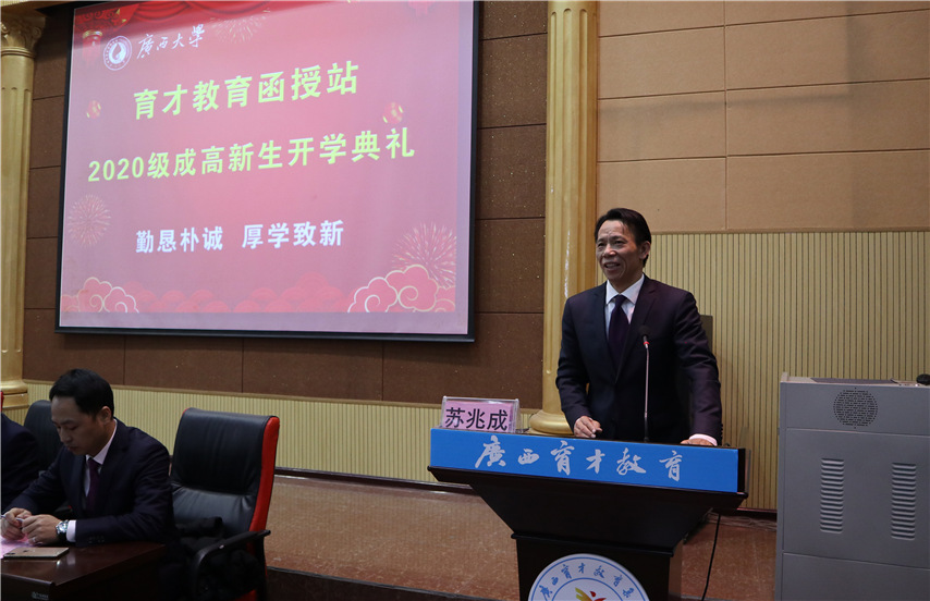 廣西大學(xué)繼續(xù)教育學(xué)院院長蘇兆成代表學(xué)校向2020級的全體新生的錄取表示熱烈的祝賀,蘇院長介紹了廣西大學(xué)悠久的發(fā)展歷史、雄厚的師資隊(duì)伍建設(shè)等優(yōu)勢以及近年所取得的成績,他與全體新生分享了四個(gè)求學(xué)的問題:一是學(xué)不學(xué)?二是學(xué)什么?三是怎么學(xué)?四是去哪里學(xué)?為全體新生上好了開學(xué)第一課,勉勵(lì)全體新生要適應(yīng)成人高等教育的教學(xué)方式和方法,合理安排好學(xué)習(xí)時(shí)間、提高學(xué)習(xí)效率,學(xué)有所成,全面提高德商、智商和情商,在適應(yīng)社會(huì)發(fā)展需要的同時(shí),成就自己的事業(yè)夢想。