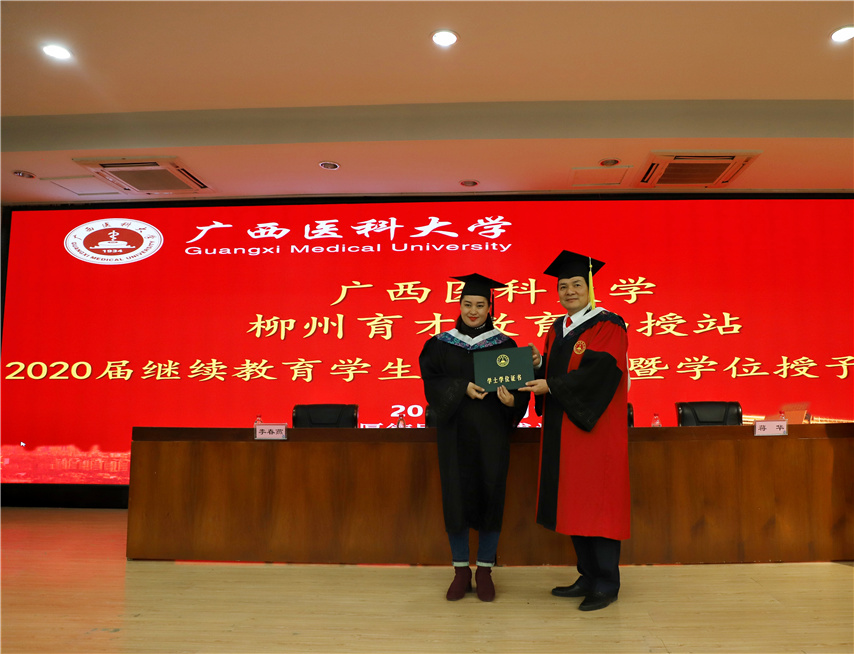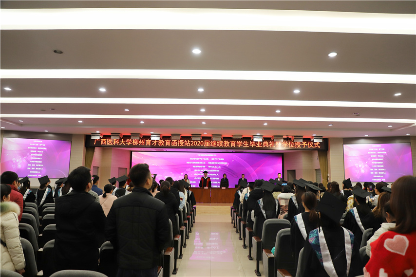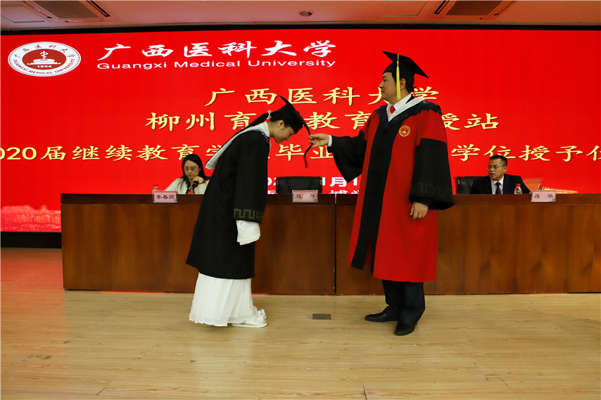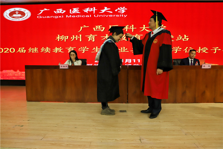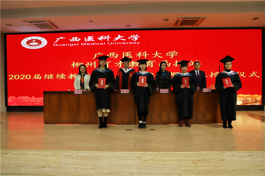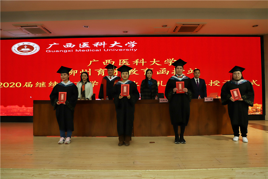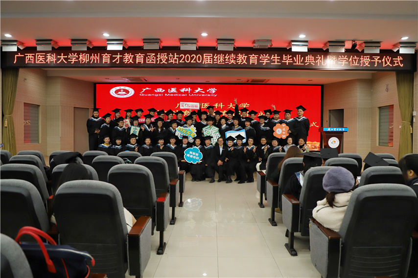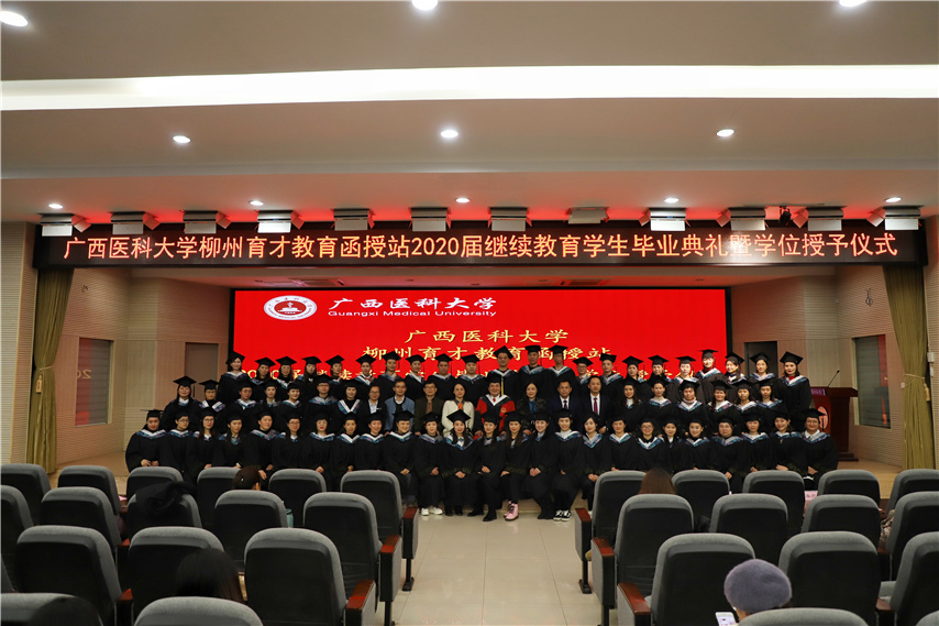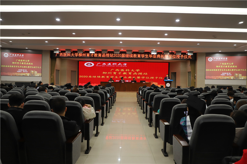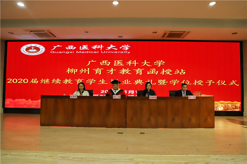 1月11日下午,廣西醫(yī)科大學柳州育才教育函授站2020屆成高畢業(yè)典禮暨學位授予儀式在柳州市人民醫(yī)院第一學術報告廳隆重舉行。廣西醫(yī)科大學繼續(xù)教育學院院長、廣西醫(yī)科大學學位評定委員會委員、主任醫(yī)師趙邦教授、副院長劉慶委、李春燕,院辦主任黃明、教務科科長馮政毅、招生工作與學生管理科科長韋先良,集團聯(lián)合黨委書記、董事長、函授站站長蔣華以及來自柳州醫(yī)藥系統(tǒng)畢業(yè)生代表參加了畢業(yè)典禮,典禮由集團聯(lián)合黨委副書記、副站長王志主持。
