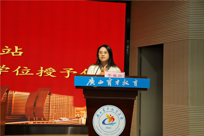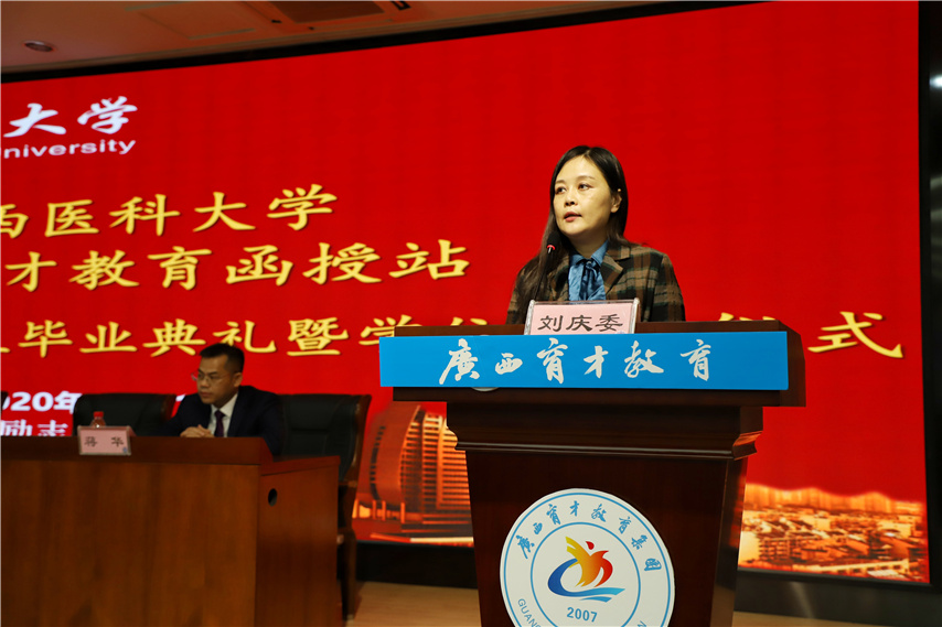 繼續(xù)教育學院副院長李春燕向圓滿完成學業(yè)的畢業(yè)生們表示誠摯的祝賀并對大力支持學校成教工作的育才函授站表示衷心的感謝。她說,同學們克服工作和家庭的壓力,披星戴月,艱苦奮斗,終于實現(xiàn)了夢想,嘗到了收獲的喜悅,這是一筆寶貴的財富,同時也完成了一個重要提升,幸福是奮斗出來的,同學們已經(jīng)用事實證明了自己的優(yōu)秀。提出三點希望:一、要繼續(xù)牢記和踐行“厚德勵志,博學弘醫(yī)”的校訓,弘揚醫(yī)大精神,掌握精湛的醫(yī)術,修德修身,醫(yī)國醫(yī)人,不斷升華自己的精神境界;二、希望同學們不忘學醫(yī)的初心,牢記使命,為自己的夢想繼續(xù)奮斗,在各自平凡的工作崗位上取得新的突破、創(chuàng)造新的輝煌,要以醫(yī)為豪,委以重任,醫(yī)學是造福人類、造福社會的學科,要牢記醫(yī)者之使命,恪守行醫(yī)的職責,懷著一顆仁愛之心,履行懸壺濟世、救死扶傷的道義;三、要不忘初心,共創(chuàng)輝煌,提高本領,擁抱生活,繼續(xù)學習,畢業(yè)不是學習的終止,要樹立終身學習的理念。不管走得多遠,飛得多高,希望同學們?;丶铱纯?,未來我們相約八桂大地,建設壯美廣西,共圓復興夢想。
