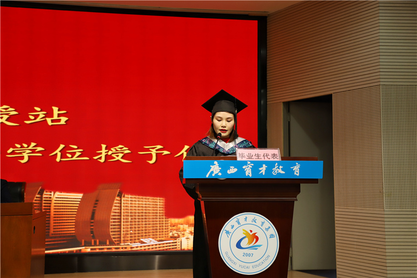 2017級護理學本科專業(yè)、來自柳州市人民醫(yī)院的王燕作為畢業(yè)生代表發(fā)言,她說,經(jīng)過三年的不懈努力,終于完成學業(yè)獲得畢業(yè)證書。但畢業(yè)并不代表結束,而是歡呼的開始,不是已經(jīng)完成,而是宣布進步,今后要不斷學習,填好人生的履歷表,為母校增輝添彩。