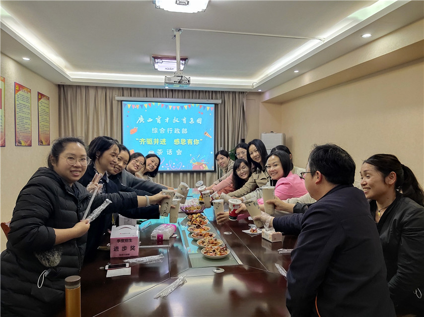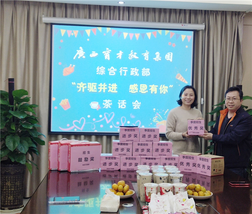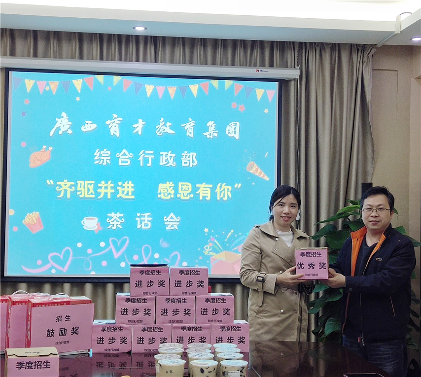 4月22日,綜合行政部“齊驅(qū)并進 感恩有你”茶話會在柳州本部舉行,集團聯(lián)合黨委委員、副總經(jīng)理王麗,綜合行政部部長蔣麗平等綜合行政部職工參加了茶話會。會上,美食相伴,更有驚喜獎品,對在第一季度招生工作中表現(xiàn)優(yōu)秀的職工進行了表彰,以資鼓勵,在歡聲笑語中相互分享了招生經(jīng)驗。同時,也為近期加入綜合行政部的伙伴送上精美禮品。