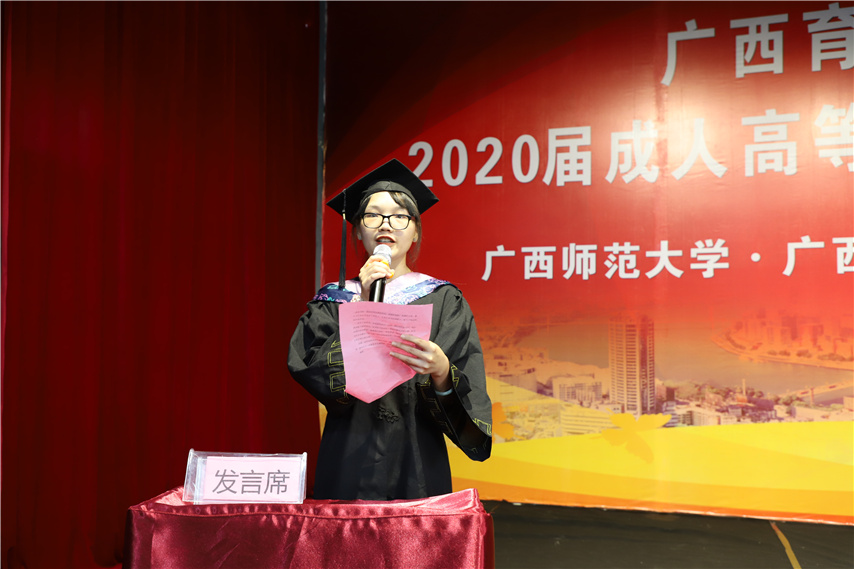 ▲2020屆廣西師范大學(xué)數(shù)學(xué)與應(yīng)用數(shù)學(xué)專業(yè)專升本的劉水英同學(xué)作為畢業(yè)生代表發(fā)言
