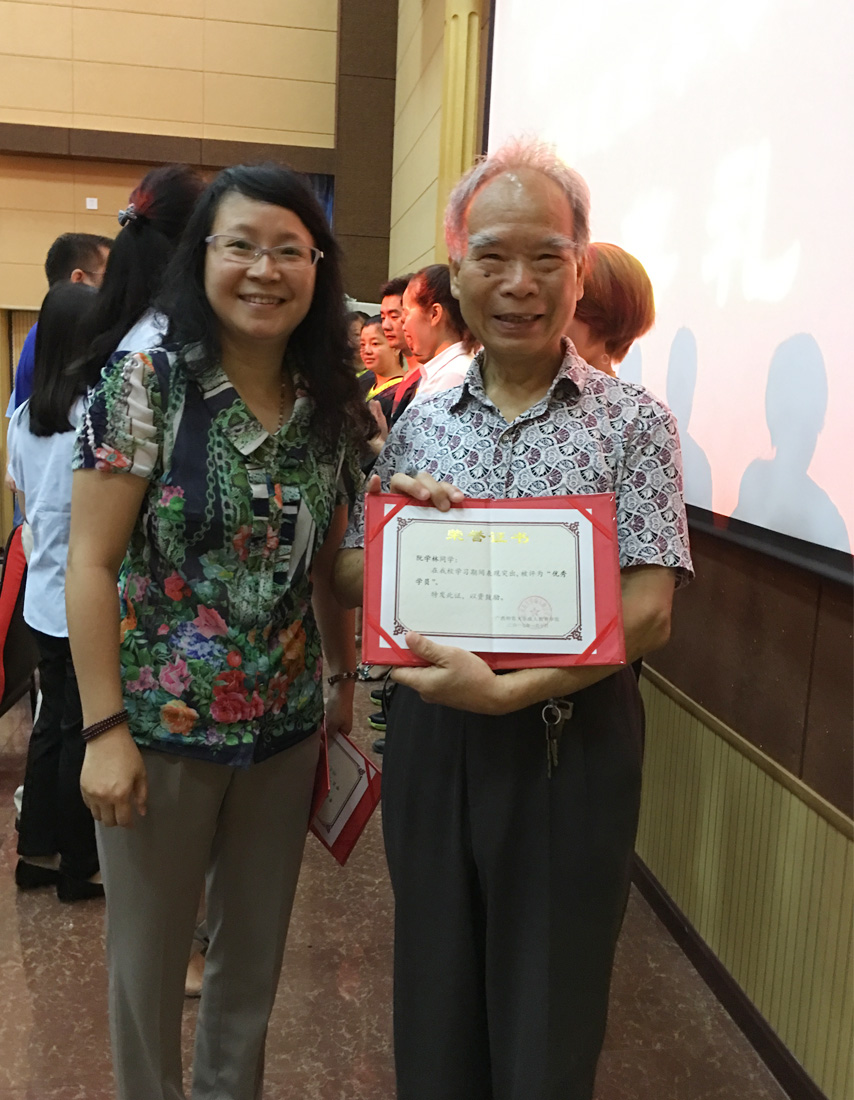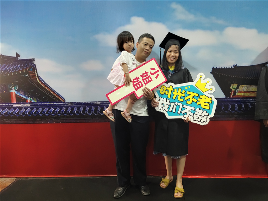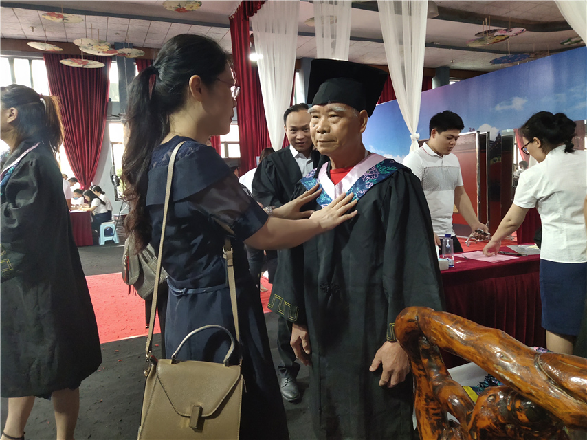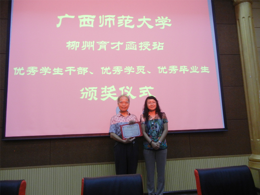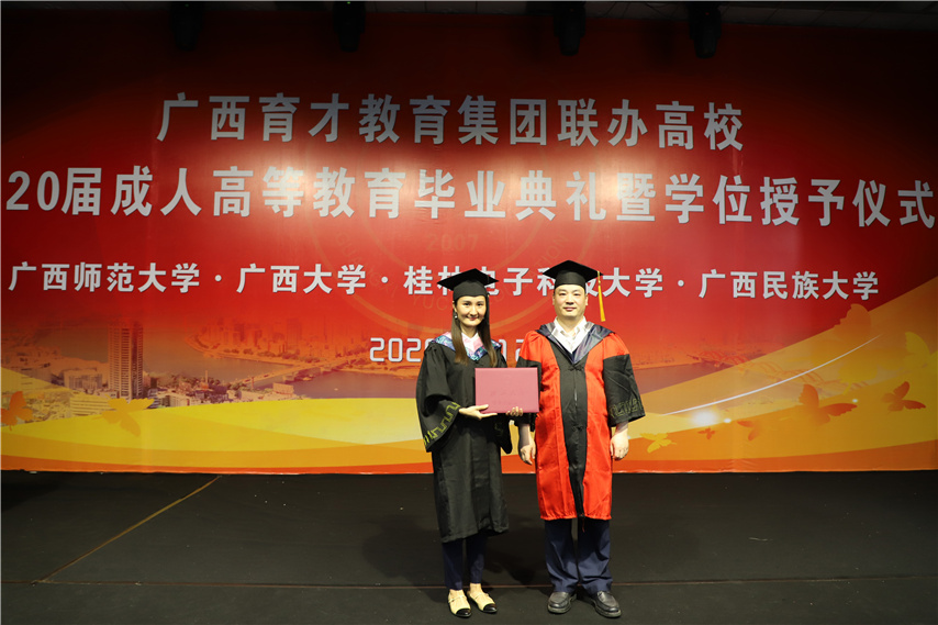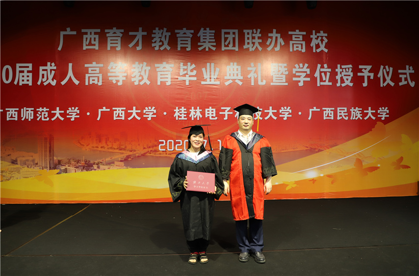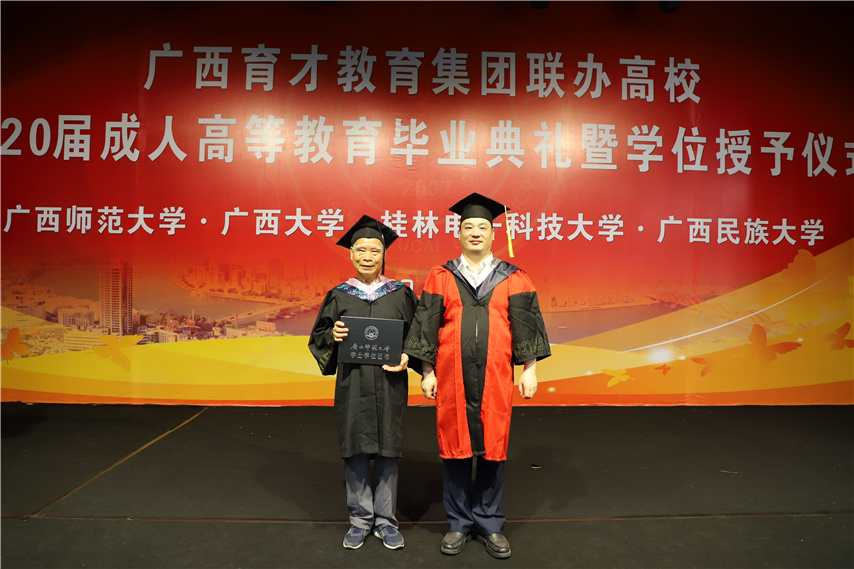 ▲2017年7月,廣西師范大學(xué)柳州育才函授站畢業(yè)典禮上,廣西師范大學(xué)繼續(xù)教育學(xué)院院長、博士劉玉紅教授為阮學(xué)林頒發(fā)專科畢業(yè)證書并合影