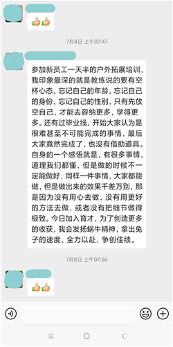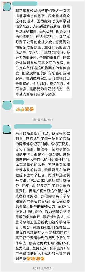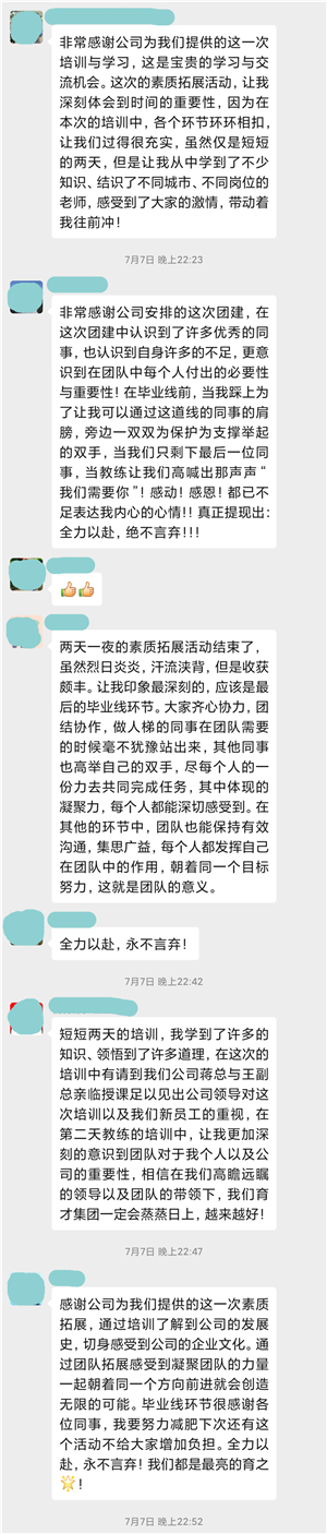 此次素質(zhì)拓展培訓(xùn)是公司探索員工培養(yǎng)方式的一次創(chuàng)新。通過兩天一夜的拓展培訓(xùn),化零為整,化整為零,所有人融合成一個(gè)大團(tuán)隊(duì),尤其將企業(yè)文化融入其中,每一個(gè)人感受到了這次培訓(xùn)形式新穎、內(nèi)容豐富,深刻理解團(tuán)隊(duì)合作、溝通、執(zhí)行的重要性。在體驗(yàn)著擔(dān)當(dāng)、奉獻(xiàn)、協(xié)作帶來的成功喜悅后,每個(gè)人都切身體會(huì)到“服務(wù)至上、共同成長(zhǎng)、促進(jìn)教育事業(yè)的發(fā)展”的企業(yè)使命和“誠信做事,做優(yōu)質(zhì)服務(wù);誠心做人,辦良心教育”的價(jià)值觀,表示在未來的工作崗位上,乘風(fēng)破浪,勇敢逐夢(mèng),譜寫自己亮麗的人生篇章。