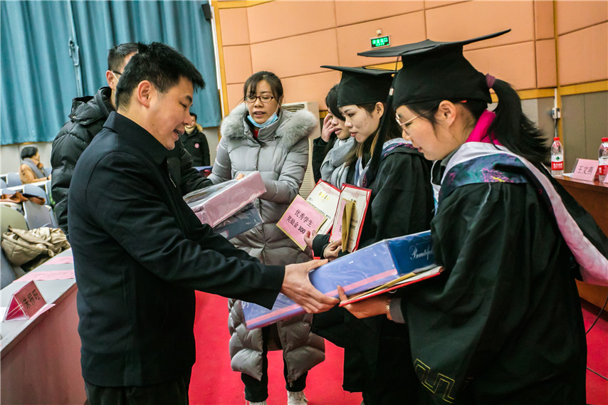 ▲領(lǐng)導(dǎo)為畢業(yè)生代表頒發(fā)畢業(yè)證書、學(xué)位證書,為在新冠肺炎疫情防控工作中表現(xiàn)突出的2021屆優(yōu)秀畢業(yè)生代表頒發(fā)榮譽(yù)證書和獎(jiǎng)金、慰問(wèn)品