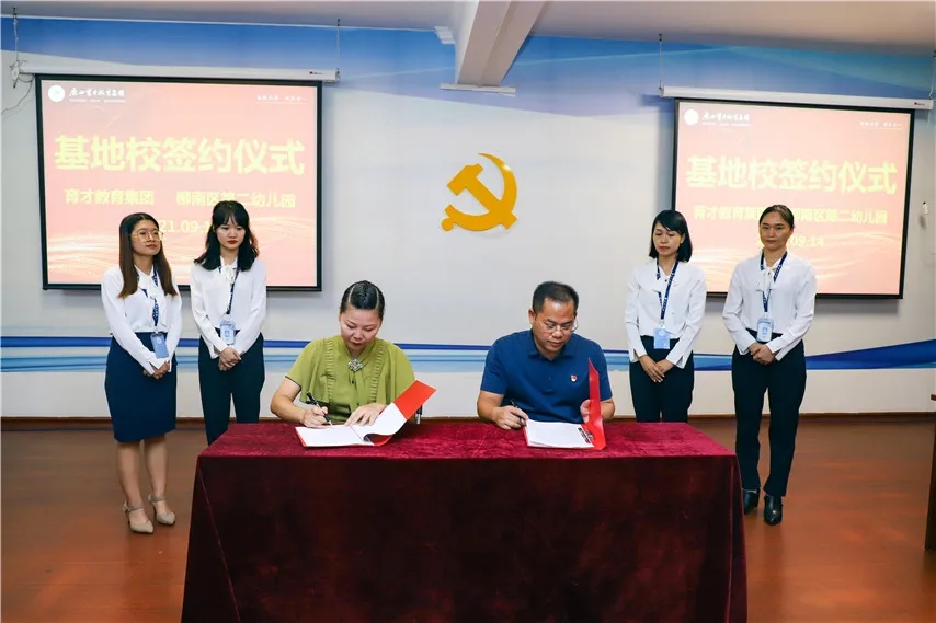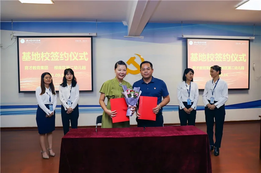 ▲集團與柳南區(qū)第二幼兒園(代表學前段)舉行基地校簽約儀式