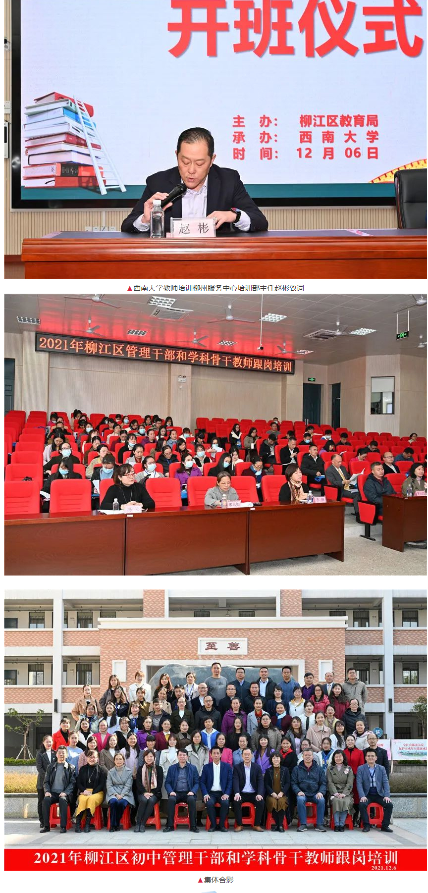12月6日,由柳江區(qū)教育局主辦,西南大學(xué)承辦的“2021年柳江區(qū)初中管理干部和學(xué)科骨干教師跟崗培訓(xùn)班”在柳州市第十五中學(xué)總部順利開班,柳江區(qū)教育局副局長(zhǎng)楊福宏,柳江區(qū)教師培訓(xùn)中心主任韋海港,西南大學(xué)教師培訓(xùn)柳州服務(wù)中心培訓(xùn)部主任趙彬出席開班儀式并講話,柳江區(qū)學(xué)校管理干部18人、學(xué)科骨干教師45人參加了此次培訓(xùn)。