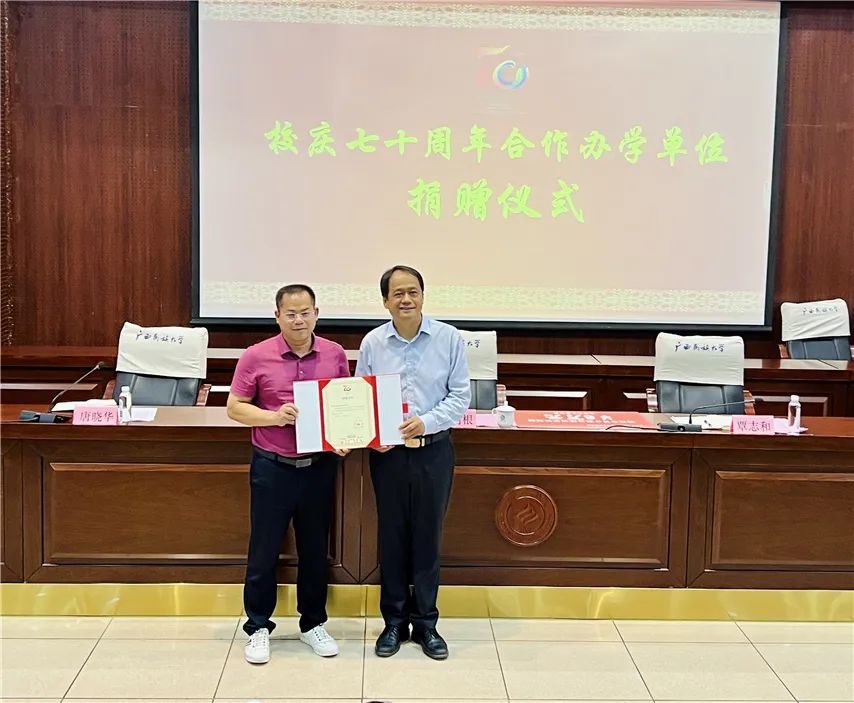 ▲函授站負責人蔣華(左)向廣西民族大學七十周年校慶捐贈6萬元