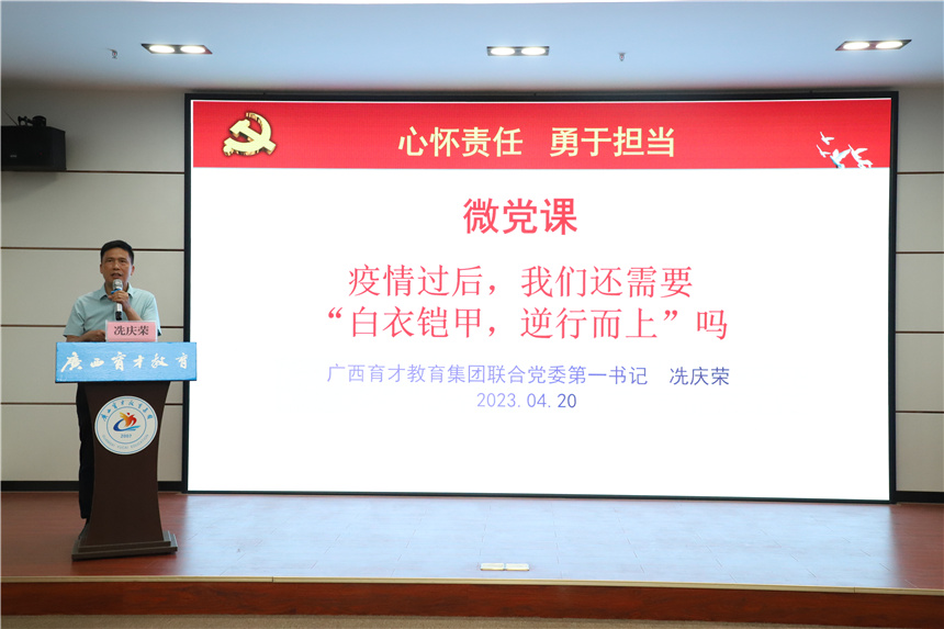 學習二十大,永遠跟黨走。開學典禮前,柳州市委組織部派駐集團黨委第一書記冼慶榮(原柳州市委黨校副校長)給學生黨員上了一堂《形勢與政策》思政課。冼書記的授課內(nèi)容豐富、圖文并茂,結(jié)合醫(yī)學類學生的工作特點及生活中的案例,給學生講授了一場精彩別開生面的思政課,課上學生也踴躍的發(fā)表了個人的看法和感想。