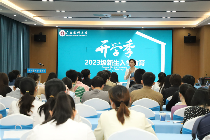 劉慶委副院長代表學校講話,她向同學們表示熱烈的歡迎和衷心的祝賀,向柳州育才教學點各位領(lǐng)導(dǎo)和教職工致以誠摯的感謝!劉慶委副院長向同學們介紹了光榮校史,共同感受學校櫛風沐雨、如詩如歌的奮斗故事,希望同學們以前輩為榜樣,開啟不一樣的“醫(yī)路人生”,做胸懷壯志、兼容并蓄、責任擔當、勇于奮進的“廣西醫(yī)大人”。她向同學們提出了三點希望:一要“厚德勵志、博學弘醫(yī)”,熔鑄母校精神、涵養(yǎng)母校氣質(zhì)、浸潤母校精魂;二要淬煉本領(lǐng),守護健康,在新時代踔厲奮發(fā),篤行不怠,勇?lián)姑?,用專業(yè)知識和能力,守護一方安康,續(xù)寫時代華章;三要不忘初心,矢志奮斗,盡快轉(zhuǎn)換角色,調(diào)整“換檔”,占領(lǐng)學習C位,實現(xiàn)人生規(guī)劃“彎道超越”。