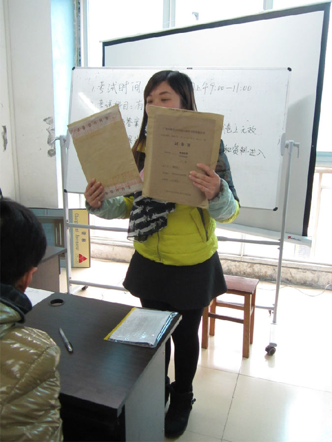 監(jiān)考老師展示密封試卷袋