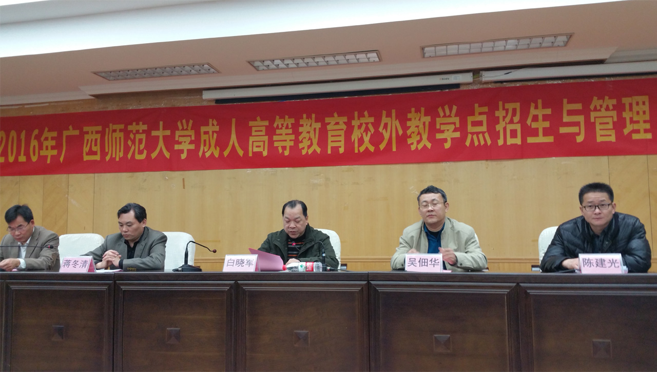 3月30日上午,2016年廣西師范大學(xué)成人高等教育校外教學(xué)點(diǎn)招生與管理工作會(huì)議在廣西師范大學(xué)育才校區(qū)隆重召開。廣西師范大學(xué)白曉軍副校長出席會(huì)議并做重要講話,會(huì)議由廣西師范大學(xué)成教院吳佃華院長主持。