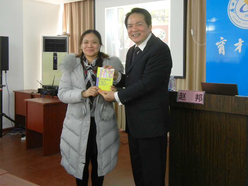 趙邦教授主編的《現(xiàn)代實(shí)用禮儀130問》書籍,育才負(fù)責(zé)人蔣華和多位學(xué)員獲得趙邦教授現(xiàn)場簽名贈(zèng)書。