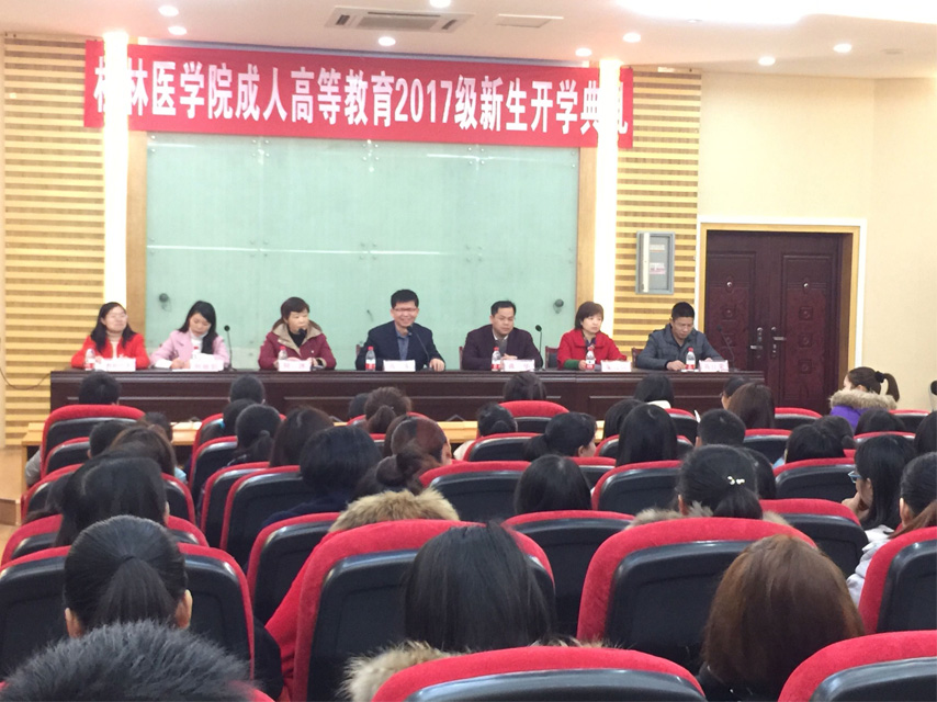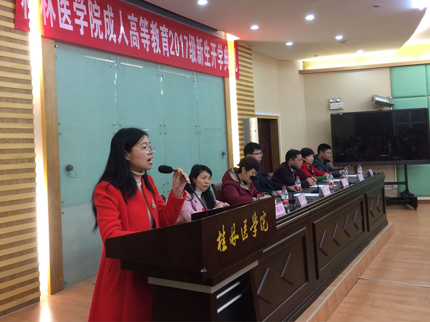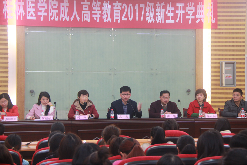 3月5日,桂林醫(yī)學院校本部成人高等教育2017級新生開學典禮在桂林醫(yī)學院東城校區(qū)弘德樓勝利召開。桂林醫(yī)學院繼續(xù)教育學院院長高東、副院長何冰、教師何麗娟、梁紅兵、廣西育才教育集團黨支部書記、董事長蔣華、集團副總、醫(yī)學部部長蔣仕榮出席典禮。典禮由何冰副院長主持。