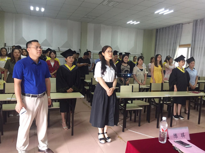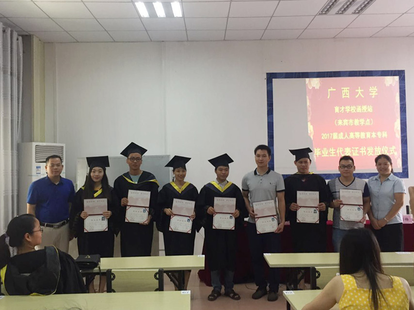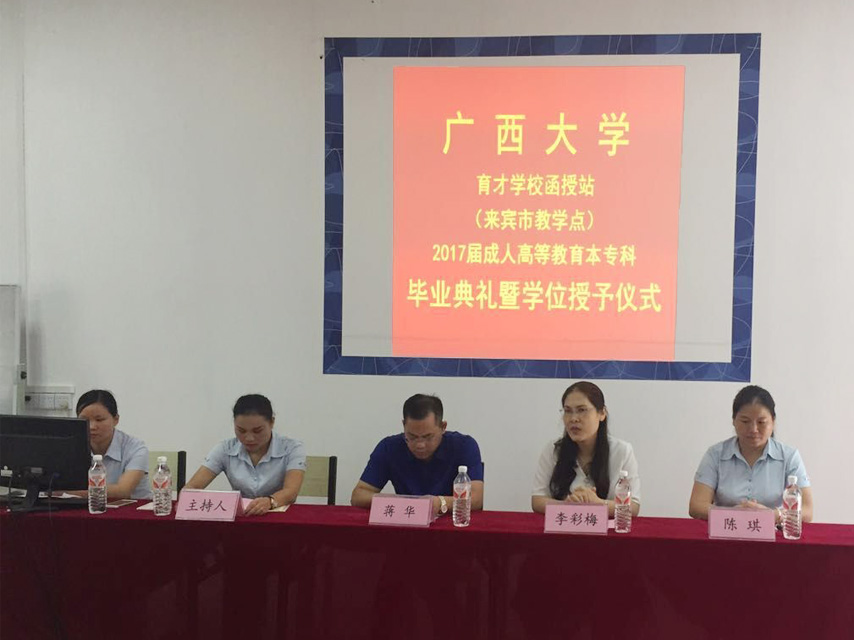 7月24日,廣西大學(xué)育才教育函授站來賓教學(xué)點(diǎn)2017屆成人高等教育本專科畢業(yè)典禮暨學(xué)位授予儀式在育才來賓分校隆重舉行,育才教育黨支部書記,董事長(zhǎng)蔣華、柳州市育才教育培訓(xùn)中心常務(wù)副校長(zhǎng)李彩梅、來賓分校教學(xué)管理老師覃妍英、陳琪、羅慧芳以及來賓市各區(qū)、縣的50多名畢業(yè)生代表參加了典禮,典禮由覃妍英老師主持。