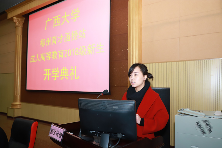 典禮上,2018級(jí)新生代表高起專工商企業(yè)管理專業(yè)的黃麗棉同學(xué)首先上臺(tái)發(fā)言,她說(shuō),成人高等教育是人生中一次重要的選擇,而廣西大學(xué)在區(qū)內(nèi)具有較強(qiáng)的影響力,讓人向往,希望可以用新的知識(shí)來(lái)開拓新的事業(yè),并提高自身素質(zhì)。隨后教師代表李禹龍進(jìn)行發(fā)言,他表示將努力做好教學(xué)工作,并用心為同學(xué)們服務(wù),營(yíng)造良好的學(xué)習(xí)氛圍,與同學(xué)們一起度過(guò)美好而充實(shí)的學(xué)習(xí)時(shí)光。