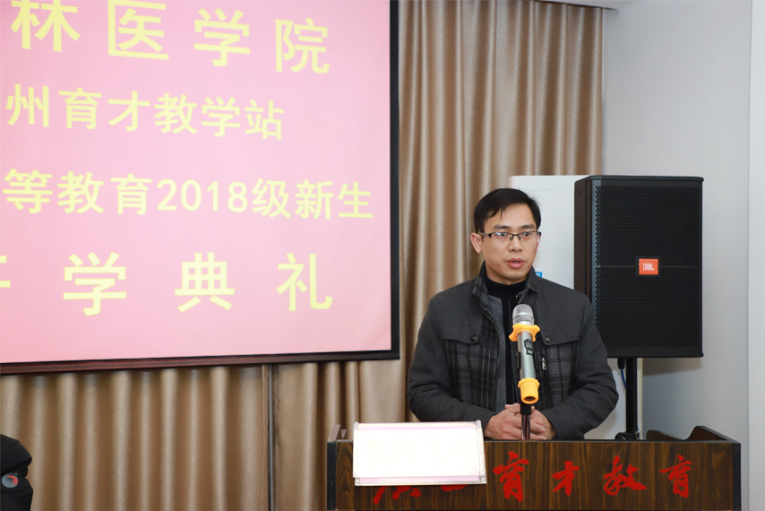 桂林醫(yī)學(xué)院繼續(xù)教育學(xué)院院長高東代表學(xué)校向全體成教新生表示誠摯的問候和熱烈的祝賀,對(duì)長期以來支持桂林醫(yī)學(xué)院成教工作的育才教育表示衷心的感謝。他著重介紹了學(xué)校的發(fā)展歷史、師資隊(duì)伍建設(shè)等情況以及近年來在成人高等繼續(xù)教育方面所取得的成績(jī),并希望2018級(jí)的新同學(xué)從今天起就要謹(jǐn)記自己是桂醫(yī)人,有機(jī)會(huì)一定要到桂林醫(yī)學(xué)院校本部去感受美麗的校園環(huán)境和良好的學(xué)習(xí)氛圍。同時(shí),要樹立信念,克服困難,把學(xué)歷提升和能力提升當(dāng)作是人生進(jìn)階的重要目標(biāo)和家庭文化傳承來看待,在三年里認(rèn)真完成學(xué)業(yè),并養(yǎng)成自學(xué)的能力和終身學(xué)習(xí)的習(xí)慣,讓自己飛得更高,走得更遠(yuǎn)。