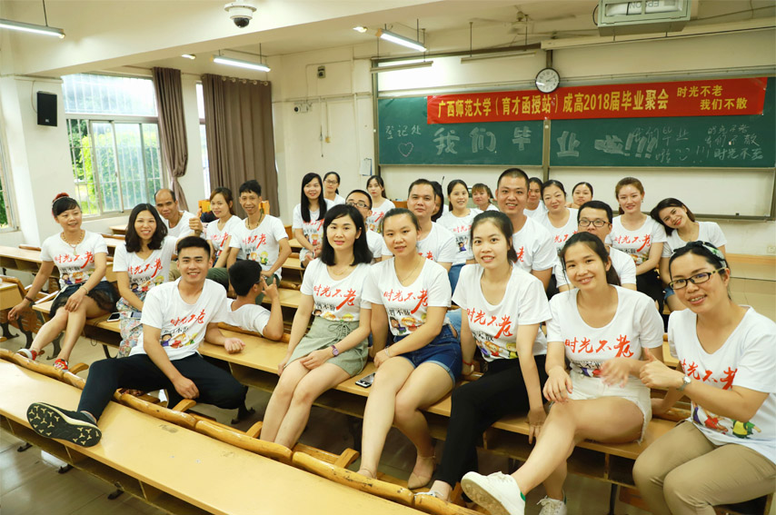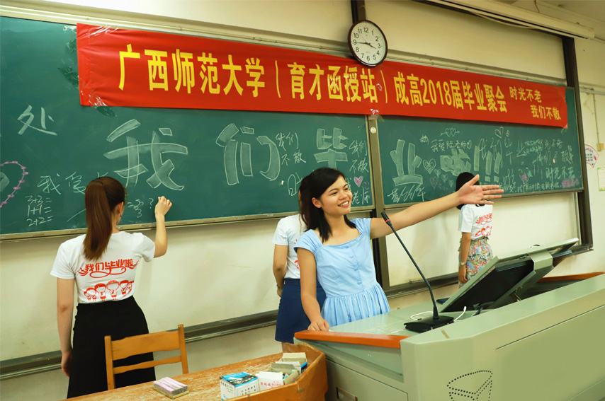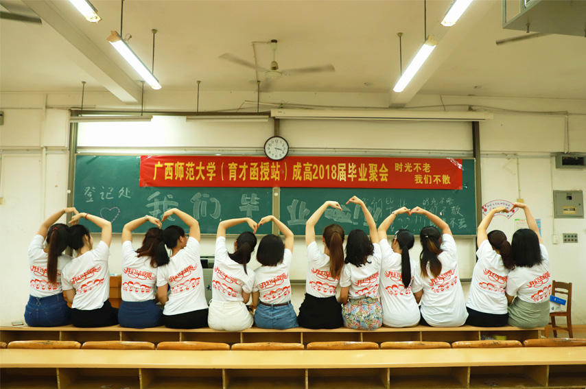 畢業(yè)典禮在奮發(fā)、圖強的廣西師范大學(xué)校歌《育才之歌》中圓滿結(jié)束。典禮結(jié)束之后,2018屆成高畢業(yè)生拍攝了集體照,并開展了畢業(yè)季創(chuàng)意留影和聚會活動,以多姿多彩的方式歡慶和紀(jì)念這一個特殊的時刻。