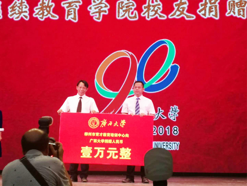 在校友捐贈(zèng)儀式上,廣西大學(xué)繼續(xù)教育學(xué)院校友會(huì)第一屆理事會(huì)理事、柳州市育才教育培訓(xùn)中心負(fù)責(zé)人蔣華代表中心向廣西大學(xué)捐贈(zèng)10000元,并祝學(xué)校辦得越來(lái)越好。繼續(xù)教育學(xué)院校友會(huì)會(huì)長(zhǎng)、繼續(xù)教育學(xué)院院長(zhǎng)蘇兆成蘇兆成會(huì)長(zhǎng)向蔣華頒發(fā)捐贈(zèng)證書(shū)。