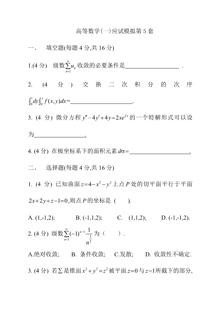 成人高考專升本高等數(shù)學(xué)(一)模擬試題五